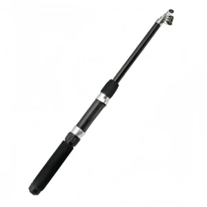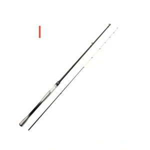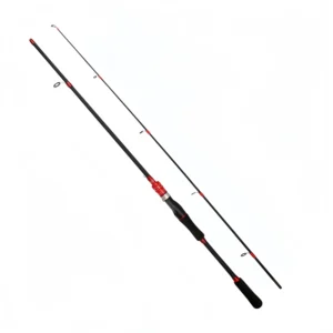 Straight-handled, medium-action, multi-section carbon fiber fishing rod.