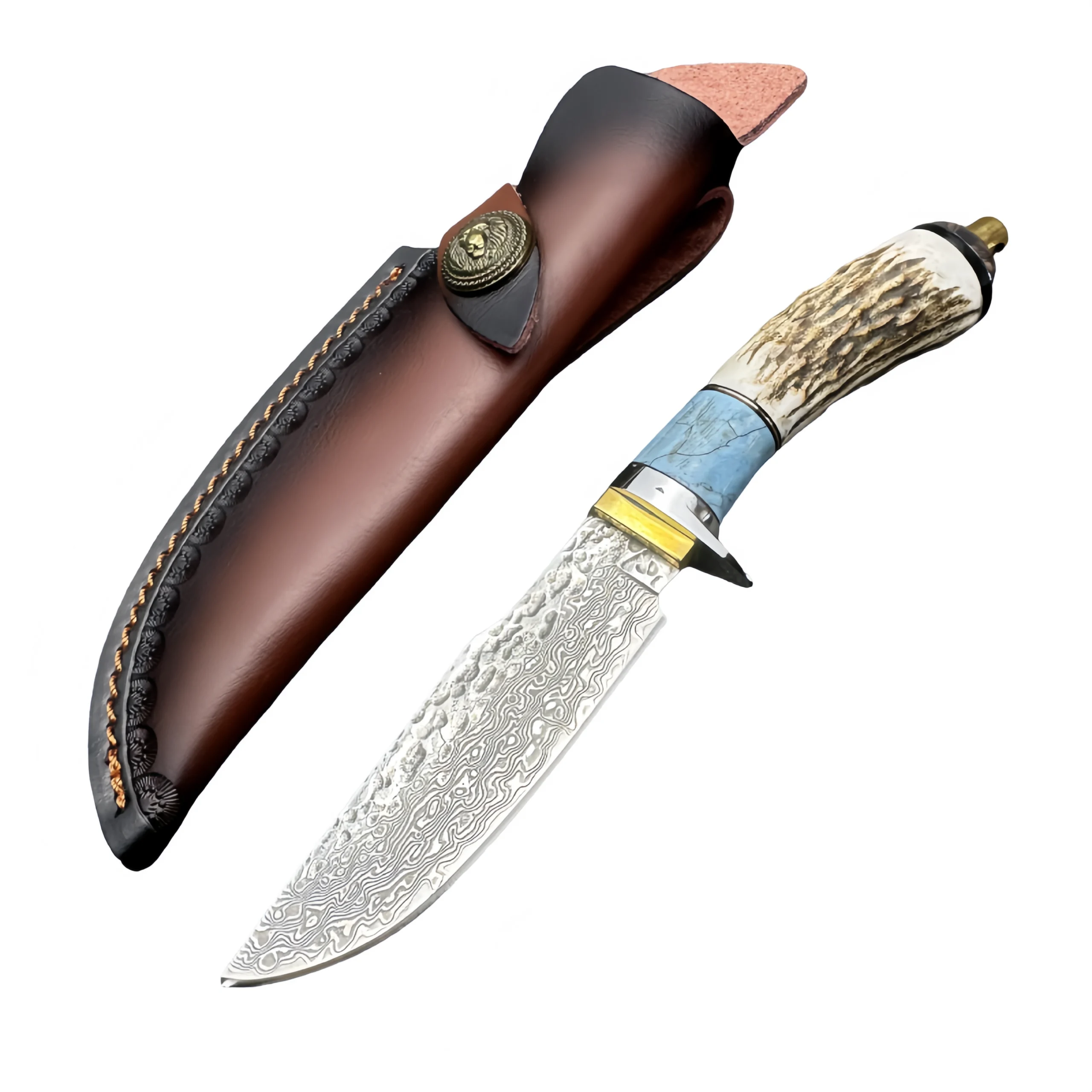 Be the first to review “Collection of straight Damascus knife with antler inlaid brass handle and cowhide sheath” Cancel reply