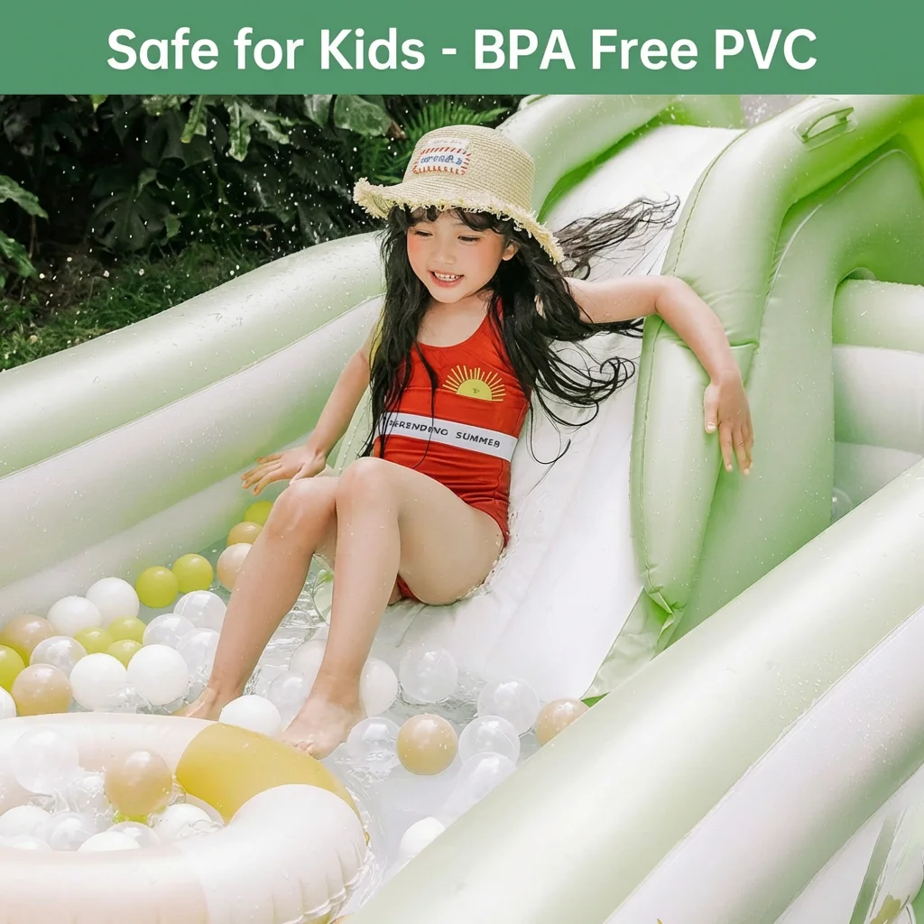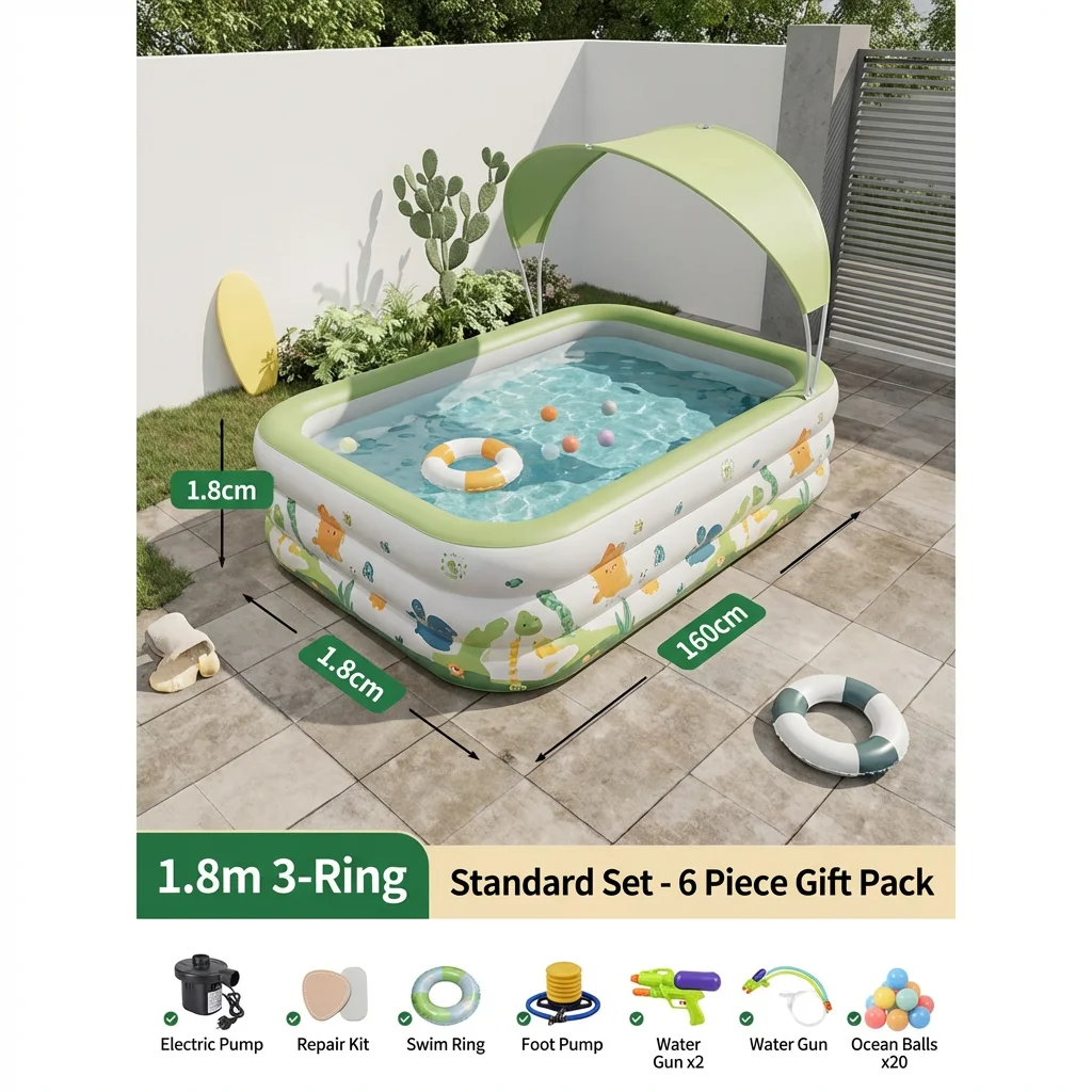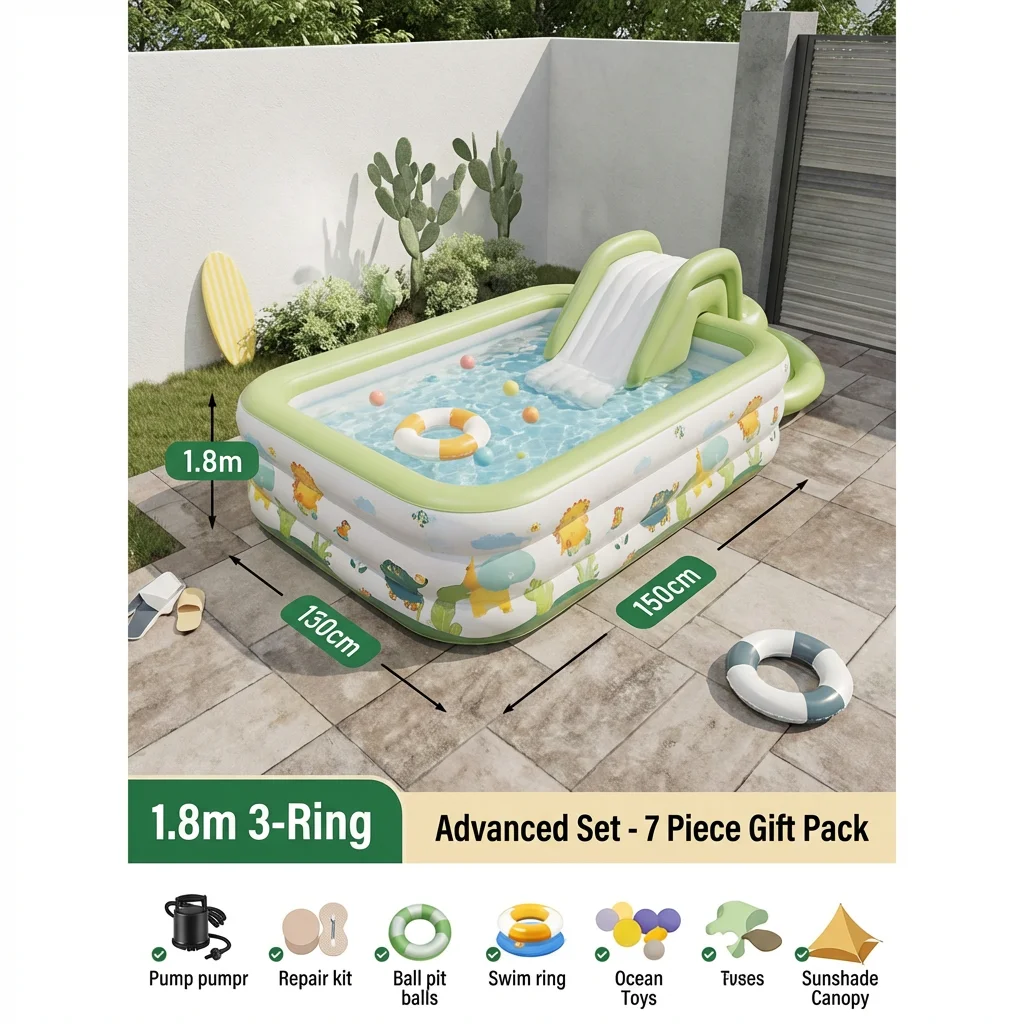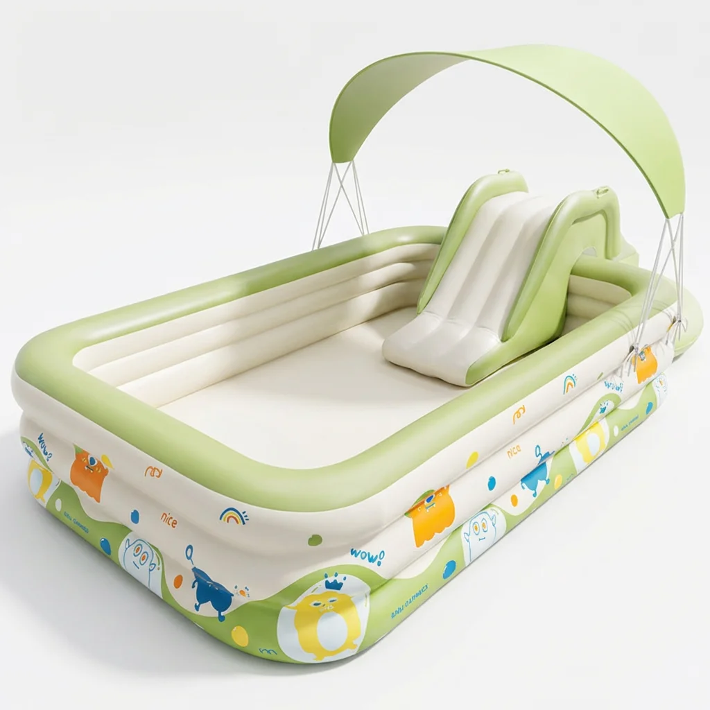 High-quality thickened PVC inflatable swimming pool for kids and adults. Available in multiple sizes with optional sunshade canopies, slides, and deluxe toy bundles.